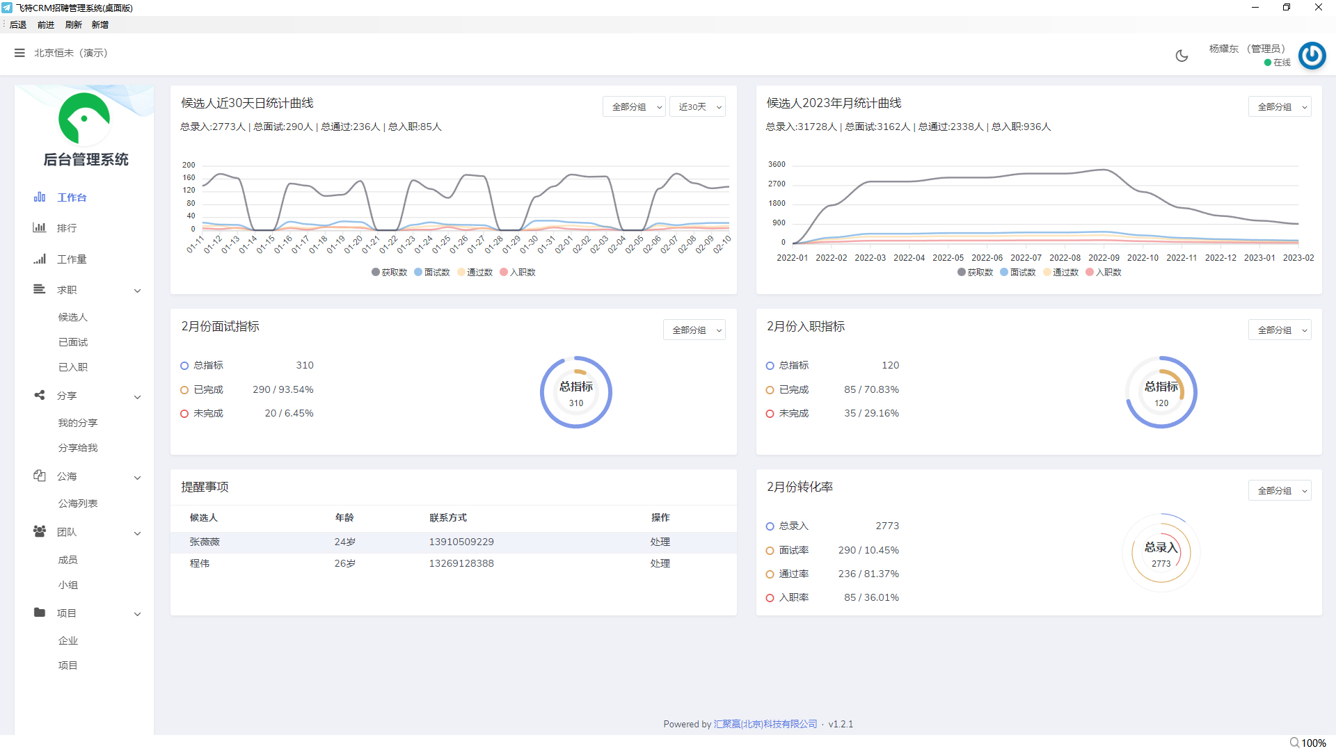 月度走势:显示系统中每月所有 录入|面试|通过|入职 数据及汇总走势走势详情;