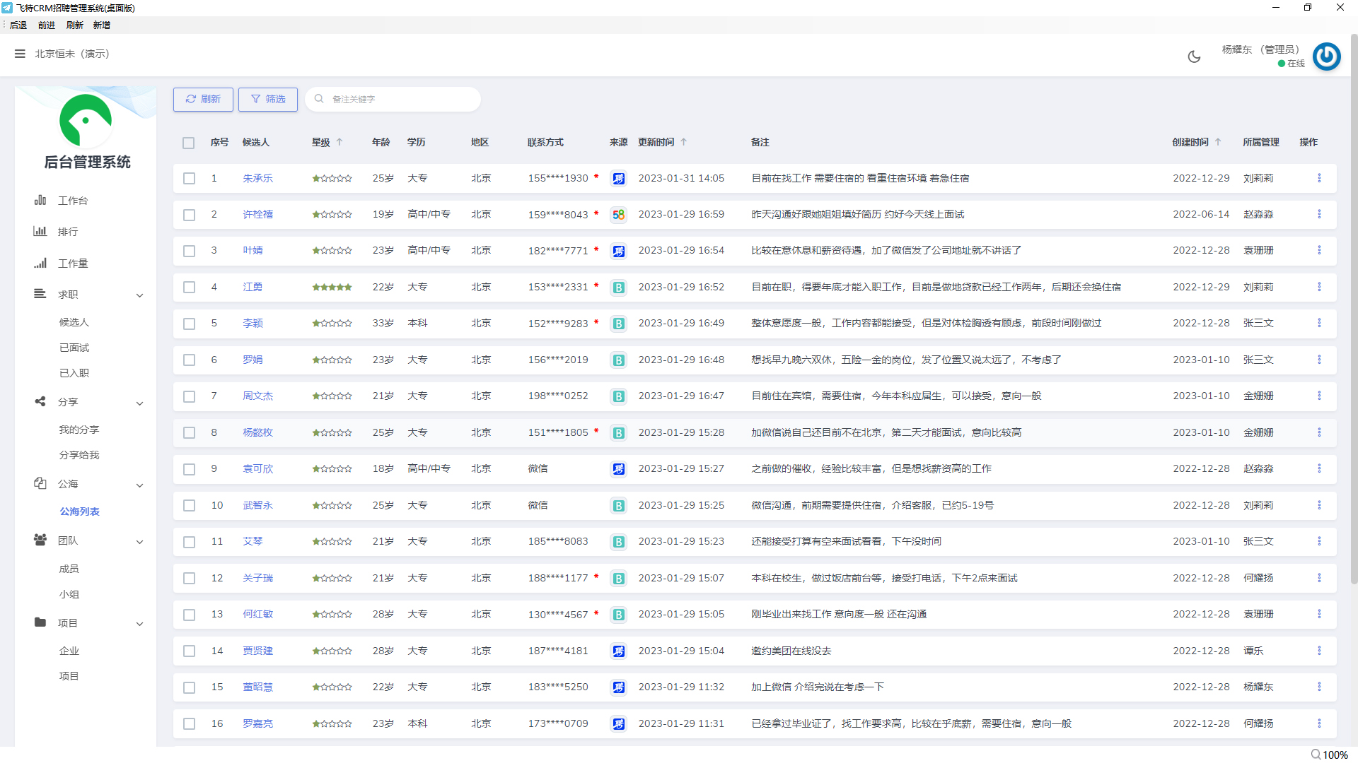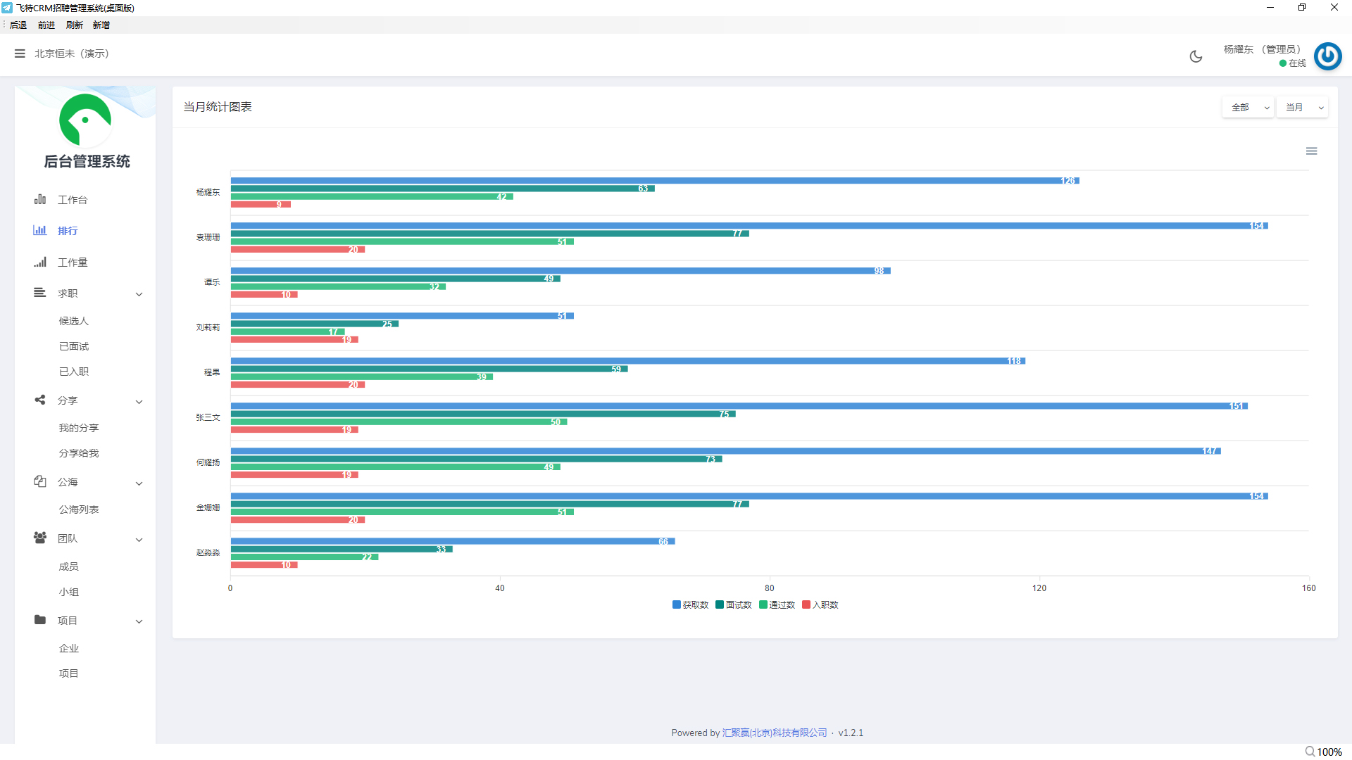“管理端可以通过业绩排行精准详细的查看每个小组每个成员当月 录入|面试|通过|入职 的具体数据,。”